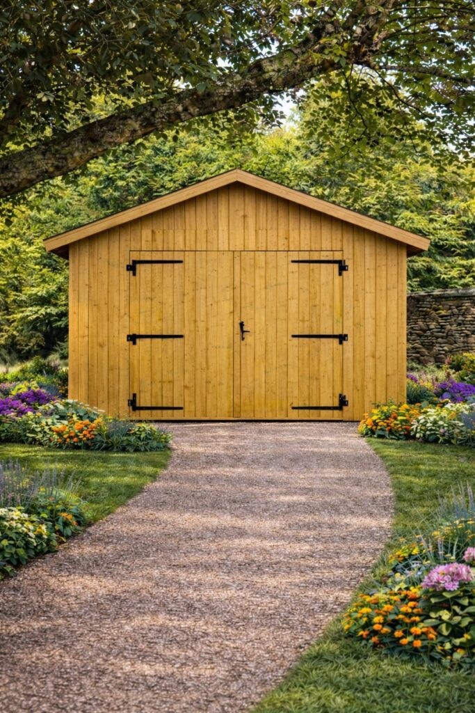 Garage bois fermé, simple ou double, avec portes, toiture au choix et finitions soignées.